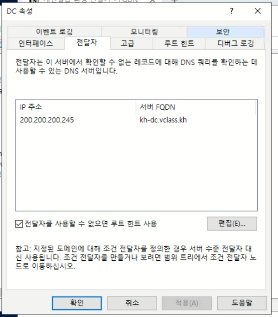 Add-DnsServerForwarder -IPAddress 200.200.200.245 -PassThru //dc 전달자 생성