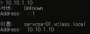 Add-DnsServerResourceRecordA -Name "sa-vcsa-01" -ZoneName "vclass.local" -IPv4Address "10.10.1.10" //정방향 호스트 추가